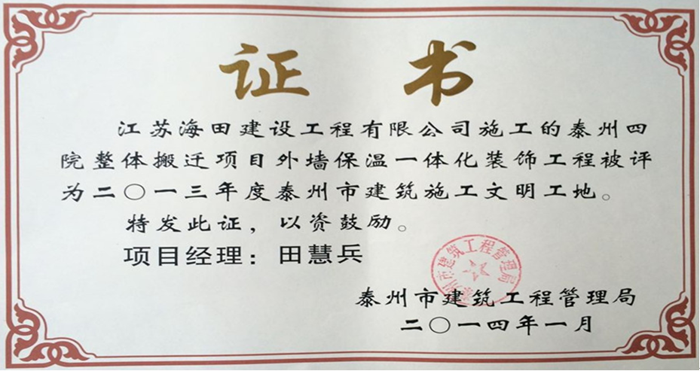 熱烈祝賀我公司承建的四人醫(yī)被評為“泰州市建筑施工文明工地”